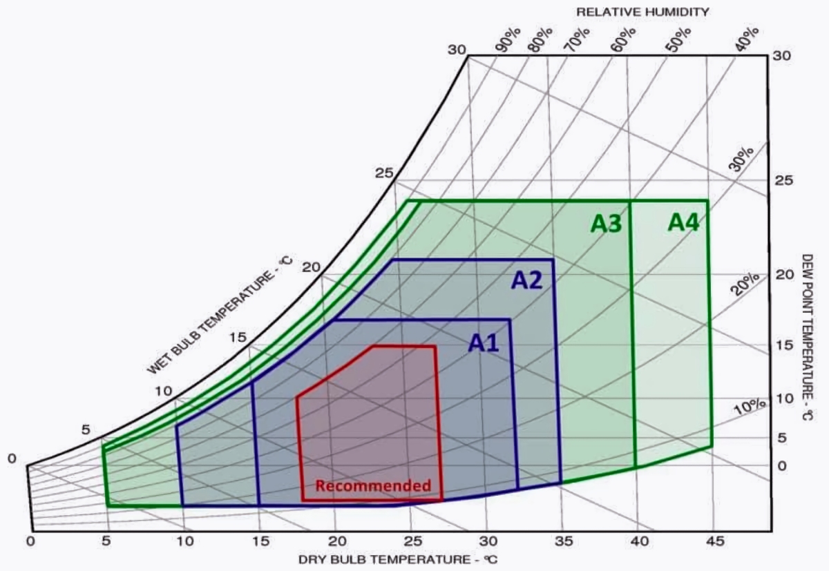 важно опираться на глобально признаваемые и авторитетные источники информации. Наиболее критическим параметром для охлаждения ИТ-оборудования является температура подаваемого воздуха. В целом, первичной задачей системы холодоснабжения является поддержание заданных значений температуры и влажности.