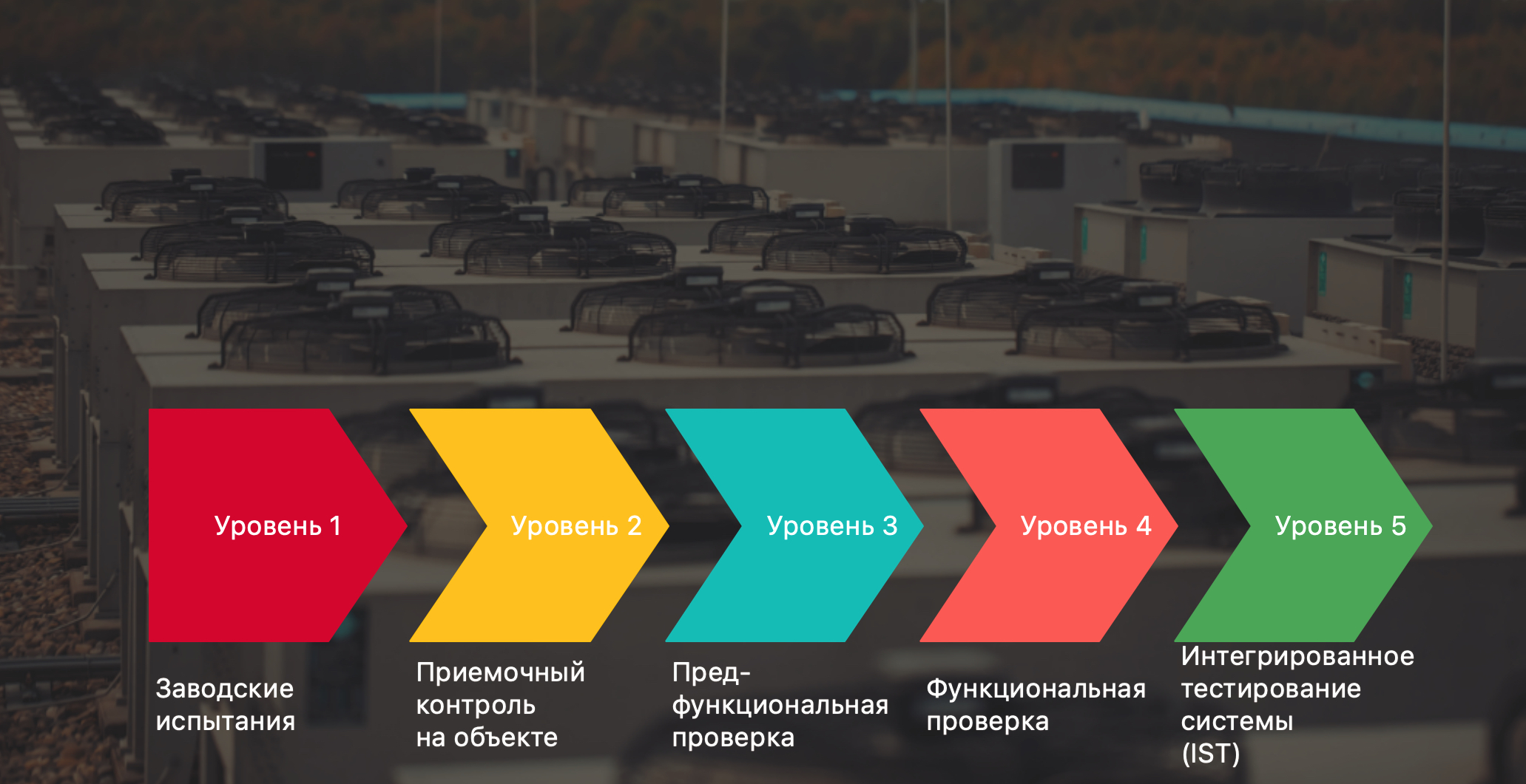 К примеру, независимые комплексные системные испытания (IST). Также нагрузочные модули используются для проверки критически важных систем на трех из пяти этапах общепринятого процесса Commissioning.