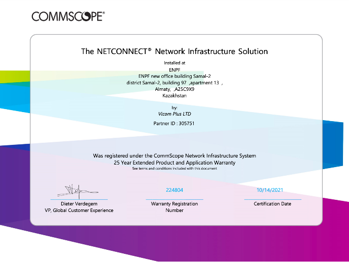 Благодаря качественно проложенным кабельным линиям и подключенным линкам с применением новейшего оборудования, а также благодаря использованию высокоточного оборудования компании FLUKE Int. при тестировании сигналов, компания Vicom Plus смогла с первой попытки подтвердить требуемый уровень качества у Производителя Commscope и получить сертификат подтверждения 25-летней гарантии!